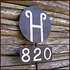 LogokylttiTolppa jossa on ruostumattomasta pellistä leikattu osoitenumero ja Hinkkasten sukuseuran logo.