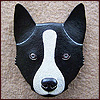 Koiranpää ovenkolkutinKarjalankarhukoiran näköiseksi muotoiltu ovenkolkutin.